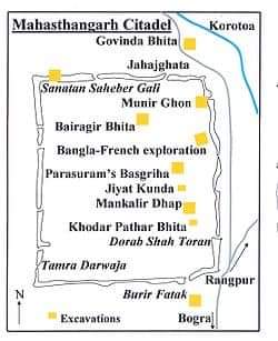 The citadel (see map alongside), the fortified heart of the ancient city, is rectangular in plan, measuring roughly 1.523 kilometres (0.946 mi) long from north to south, and 1.371 kilometres (0.852 mi) from east to west, with high and wide ramparts in all its wings. Area of the citadel is approximately 185 ha. The Karatoya, once a mighty river but now a small stream, flows on its east.