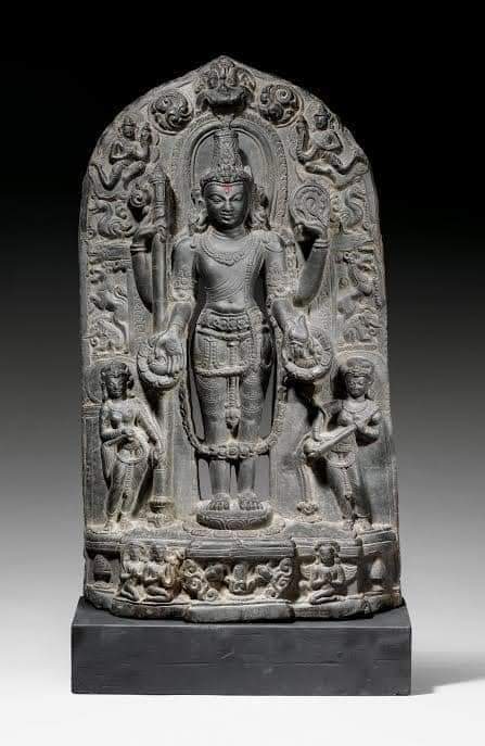 Black Stone Stele Depicting the Four-Armed Vishnu, well carved in openwork standing on a double-lotus throne, his four hands holding the staff, chakra and conch shell, wearing a short dhoti secured with a festooned belt, a sash and sacred thread around the torso, multiple necklaces and other jewelry, the face with full lips, aquiline nose and downcast eyes beneath incised brows, the hair drawn into a high chignon and secured with a foliate crown, flanked by Lakshmi and Saraswati holding the flywhisk and vina respectively, over-arched by his avatars encircled by scrollwork on the throneback,  the arched mandorla centered by a kirttimukha mask and two apsaras