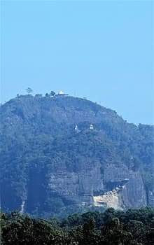 Chandranath Temple, which sits atop the hill of the same name, as seen from Dhaka-Chittagong railroad. Birupaksha temple can also be seen near the centre of the photo.