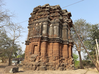 The board put up by the ASI says “Built in laterite, the temples are, Tri-ratha on plan and followed the typical Orissan style. The temples are interesting for fine corbelled archs at their entrances and supposed to have been erected during the time of Prithvi Malla (1346 A.D.)”.