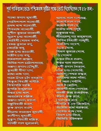 Other Honorable Bengal Legislature Members voting for the Hindu homeland of West Bengal included Sri Gobindalal Banerjee, Sri Pranatha Nath Banerjee, Sri Shibnath Banerjee, Sri Sushil Kumar Banerjee, Sri Suresh Chandra Banerjee, Sri Mohini Mohan Barman, Sri Hemanta Kumar Basu, Sri Charu Chandra Bhandari, Sri Satish Chandra Basu, Sri Mihir Lal Chatterjee, Sri Annada Prasad Chaudhuri, Sm. Bina Das, Sri Radha Nath Das, Sir Uday Chand Mahatab, Sri Nikunja Bihari Maiti, Sri Bishapati Majhi, Sri Bhupati Majumdar, Sri Ishwar Chandra Lal, Sri Asutosh Mallik, Sri Annada Prasad Mandal, Sri Banku Bihari Mandal, Sri Krishna Prasad Mandal, Sri Shyama Prasad Mukherjee, Sri Dhirendra Narayan Mukherjee, Sri Kalipada Mukherkjee, Sri Mukunda Bihari Mallik, Sri Basanti Lal Murarka, Sri Khagendra Lal Dasgupta, Sri Kanai Lal Das, Sri Harendra Nath Dalui, Sri Sukumar Dutta, Sri Nihrendu Dutta Majumdar, Sri Bipin Behari Ganguli, Sri Arabind Gayesh, Sri AK Ghosh, Sri Bimal Kumar Ghosh, D Gomes, Sri Dambar Singh Gurung, Sri Ishwar Das Jalan, Sri Debi Prasad Khaitan, Sri Charu Chandra Mohanty, Sri Ardhendu Shekhar Naskar, Sri Jadabendra Nath Panja, AR Anthony, RE Pletel, Sri Anandai Lal Poddar, Sri Rajani Kant Pramanik, Sri Kamal Krishna Ray, Sri Jogeswar Ray, Sm. EN Rickets, Sri Rajendra Nath Sarkar, Sri Debendra Nath Sen, Sri Bimal Chandra Singha, GCD Wilks and finally with a massive 58 votes against 21, the official proposal to create West Bengal was passed.