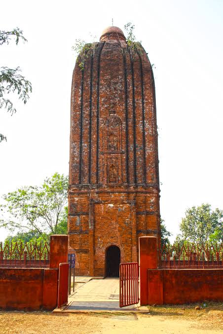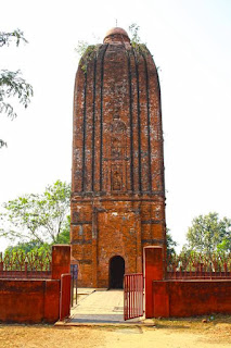 The only one is about 18 m high tower (rekha-deul) with screen top (chhatri) and an internal, windowless Cella (garbhagriha) existing brick temple stands on a nearly square base of about 9,10 × 9,00 m; the basic dimensions of approximately 4.50 m high Cella, in contrast, amounts only to about 2.50 × 2.50 m. Noteworthy are the – however, for a Rekha-Deul usual – steep proportions in the lower part by a plurality of cornices are arranged, whereas in the upper part only vertical gradation find. A dome-shaped curvature of the construction developed only in the last meters.