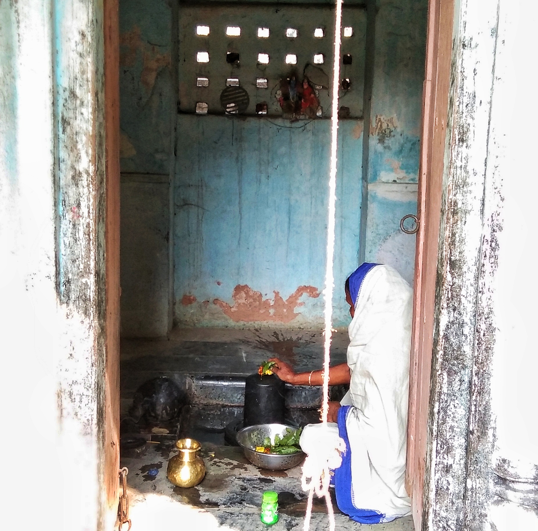 An elderly woman can be seen worshipping Lord Shiva as this is a live temple.