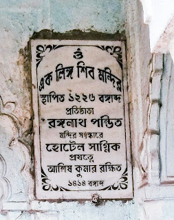 Plaque on the wall of the temple contains false information as this temple was not built in 1226 Bangabda (1820 CE) but well before the death of Shuja-Ud-Daula in 1739 CE. It is heard that somewhere between 1741-1750CE, a Maratha Borgi Senapati named Bhaskar Pandit had donated some of his loot for the preservation of this temple. It was rebuilt in 1820 by one his descendants Ranganath Pandit.