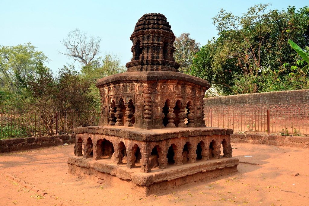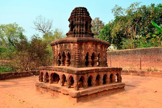 The Stone Chariot was built some time in the 17th Century. This small double storied structure stands on low laterite plinth, originally with three wheels on each side. The lower story resembles the arched pavilion of rasmancha, whereas the upper story with shikara resembles typical ekaratna temples of Bishnupur.