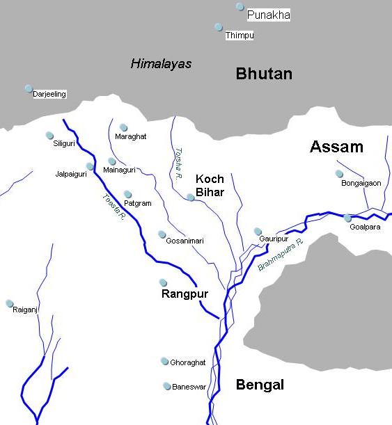 The geographical boundary of the Kingdom was defined by Nature. The Baranadi and the Brahmaputra rivers constitute the eastern boundary while the river Tista and the Karatoya the western boundary. In the northern flank Bhutan constitutes the border. The confluence of the Brahmaputra and the Karatoya in Rangpur district, now in Bangladesh, defines its southern border. With the passage of time the administrative jurisdiction of the Koch Kingdom changed in phases. The inner area of the Kingdom is plane with a slight incline on the south-eastern flank along the courses of the major rivers of the Kingdom. There are nominal ups and downs but some regions are so low that they get flooded during rainy seasons. No mountain or hill inside the region is there.